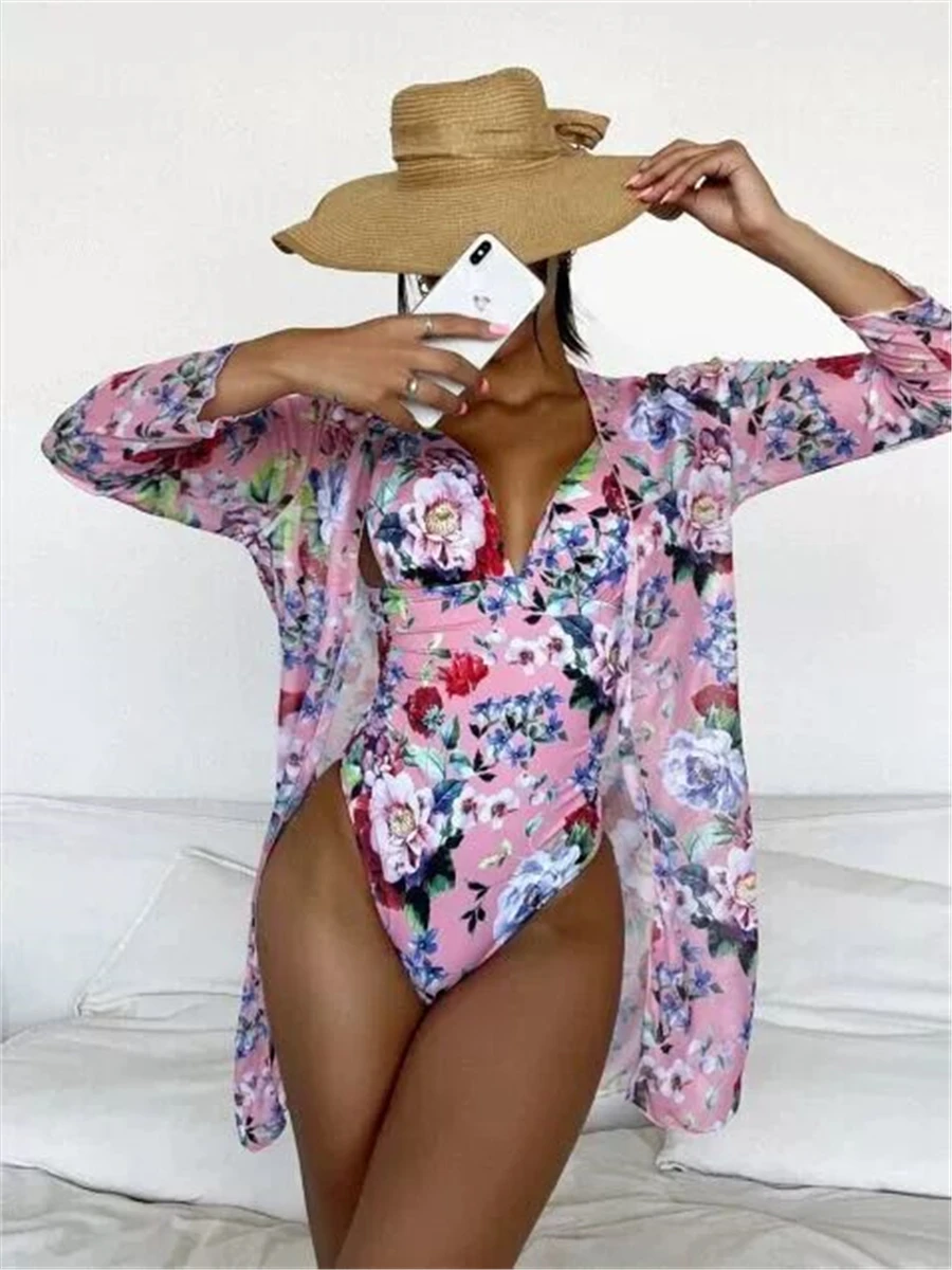 Floral Printed Long Sleeve Swimsuit Women One Piece Padded Swimwear Female Cover Up Beachwear Push Up Bathing Suit Swim Bodysuit