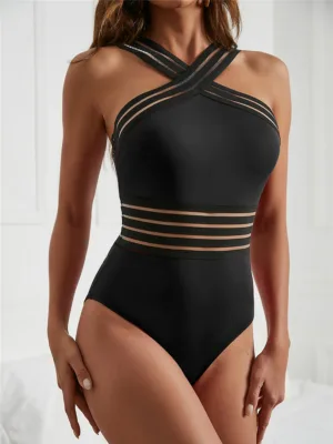 Solid Mesh Tape Swimsuit 2025 One Piece Sexy High Neck Swimwear Women Cross Front Bathing Suit Female Padded Beachwear Bodysuit
