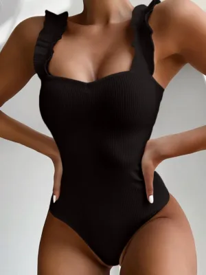 Straped Ruffle Monokini Swimsuit Women One Piece Backless Swimwear Female Solid Bodysuit Padded Bathing Suit Bathers Beachwear