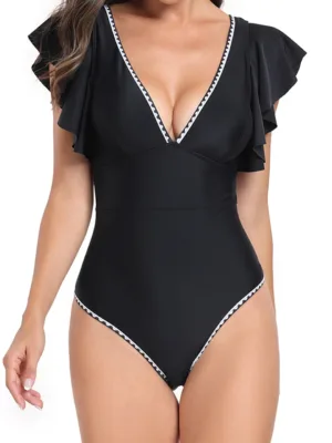 One Piece Ruffle Sexy Bodysuit 2025 Women Solid Deep V-Neck Swimwear Female Padded Swimsuit Bathing Swimming Summer Beachwear